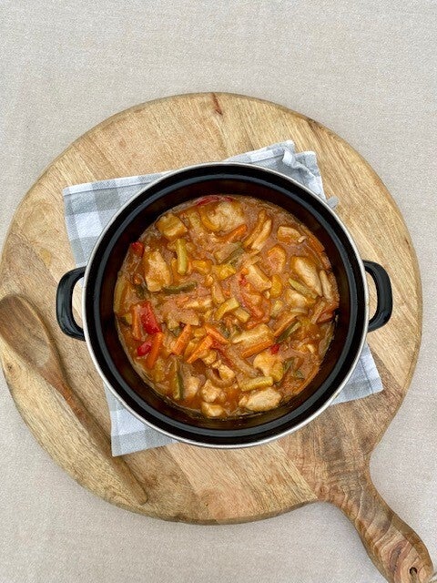 300 ml water, 75 ml azijn, 75 ml appelmoes (of 1 appel) 240 gram uien, 260 gram courgette, 100 gram wortel, 100 gram paprika, 550 gram kipreepjes/stukjes (rauw)